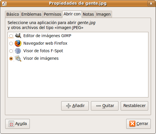 Abrir con. Aparece únicamente en el caso de los archivos. Nos muestra una lista de las aplicaciones capaces de abrir ese tipo de archivo. Una de ellas estará marcada significando que es la aplicación asociada por defecto. Si queremos añadir más aplicaciones pulsamos el botón Añadir.