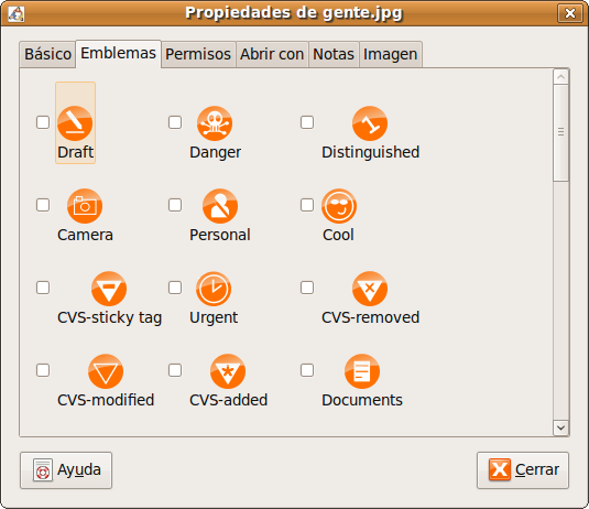 Emblemas. Nos permite elegir pequeños gráficos que se superponen al icono y nos sirven para tener más información o simplemente decorarlo.